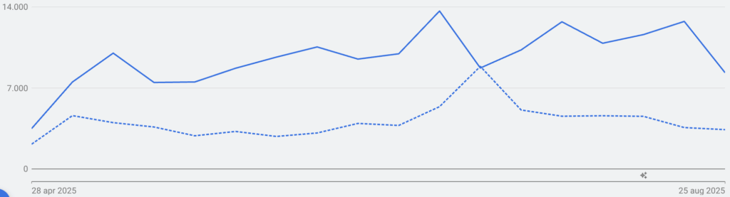 – – = Vertoningen Google Ads – 1 mei t/m augustus 2024